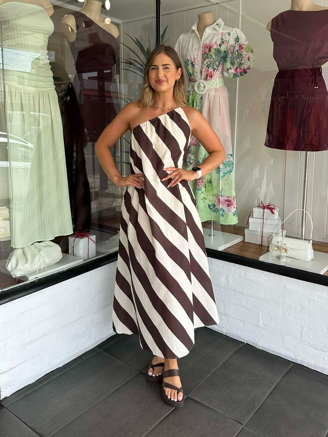 This easy-to-wear one-shoulder Kassandra dress features delicate bead detailing and a flowy silhouette that moves effortlessly. Designed with a chic brown and white stripe pattern, it’s perfect for adding a touch of effortless elegance to your wardrobe.