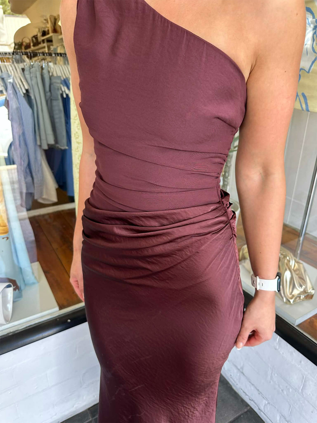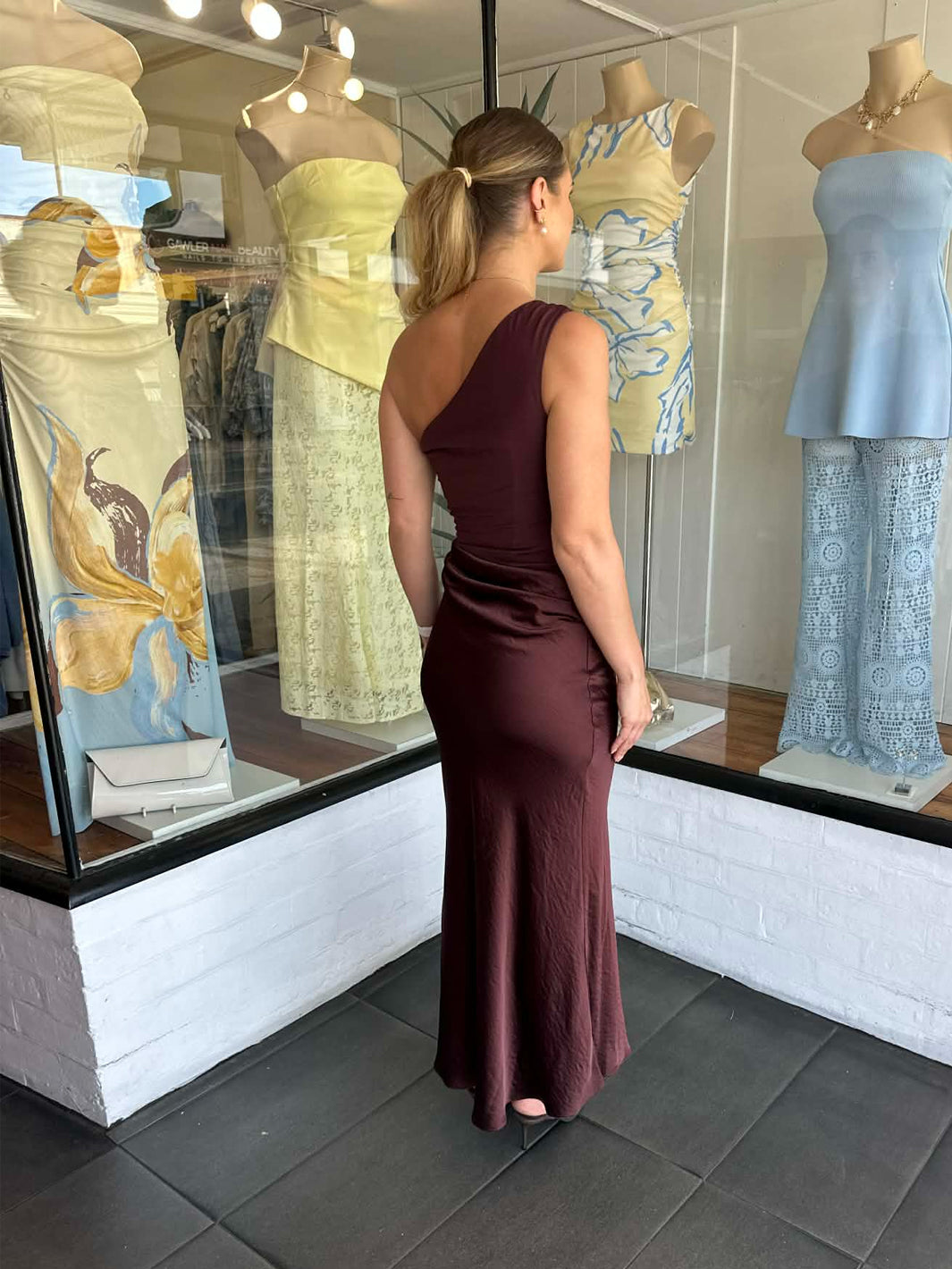 Designed to flatter, this one-shoulder maxi dress features a sleek asymmetric neckline and softly ruched detailing through the body for a sculpted fit. Crafted in a smooth, silk like fabric it skims the silhouette before falling into an elegant maxi length. Perfect for formal events or evening occasions, this timeless style pairs effortlessly with minimal heels and refined accessories.