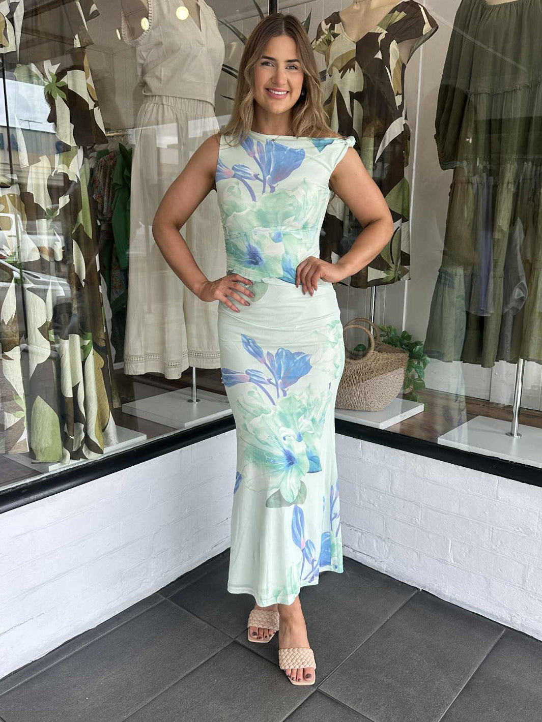 Turn heads in this elegant Signe Jersey Dress. Crafted from a stretch printed mesh fabrication featuring a soft watercolour floral print. The asymmetric neckline and knot detail at the shoulder add a modern, feminine touch, while ruched side seams create a flattering, sculpted silhouette. Designed in a bodycon fit and maxi length, this piece effortlessly combines sophistication and allure.