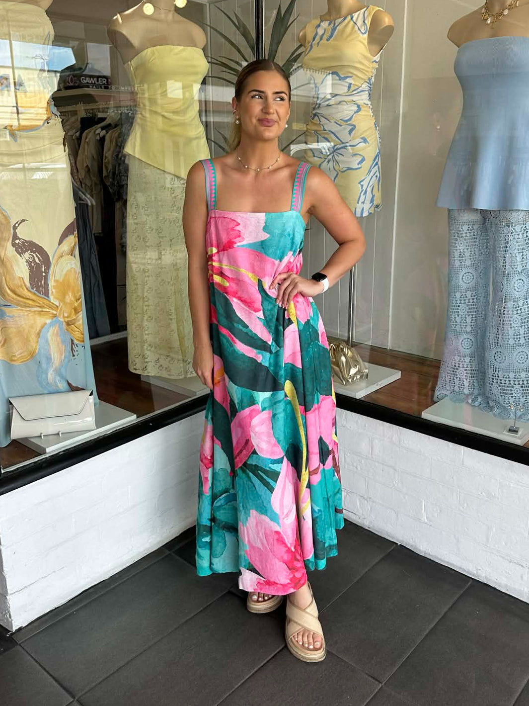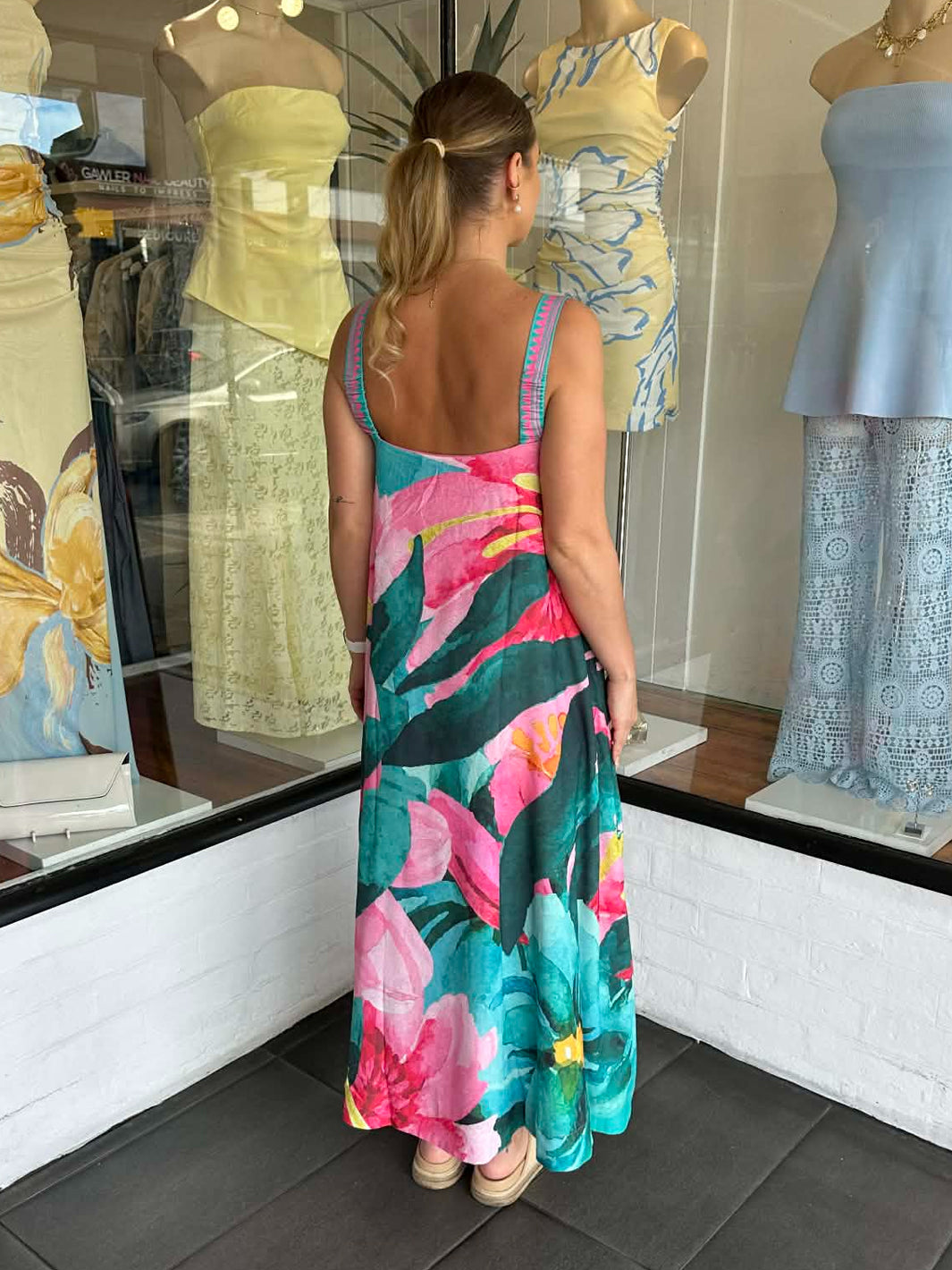 Turn heads in this vibrant, tropical-inspired maxi dress. Featuring a bold floral print in rich teal, pink, and green tones, this dress is designed with a flattering square neckline and wide shoulder straps accented with subtle contrast stitching. The top flows into a relaxed, full-length skirt that moves beautifully with every step. Lightweight and breathable, it’s perfect for warm days, holidays, brunch dates, or summer events.