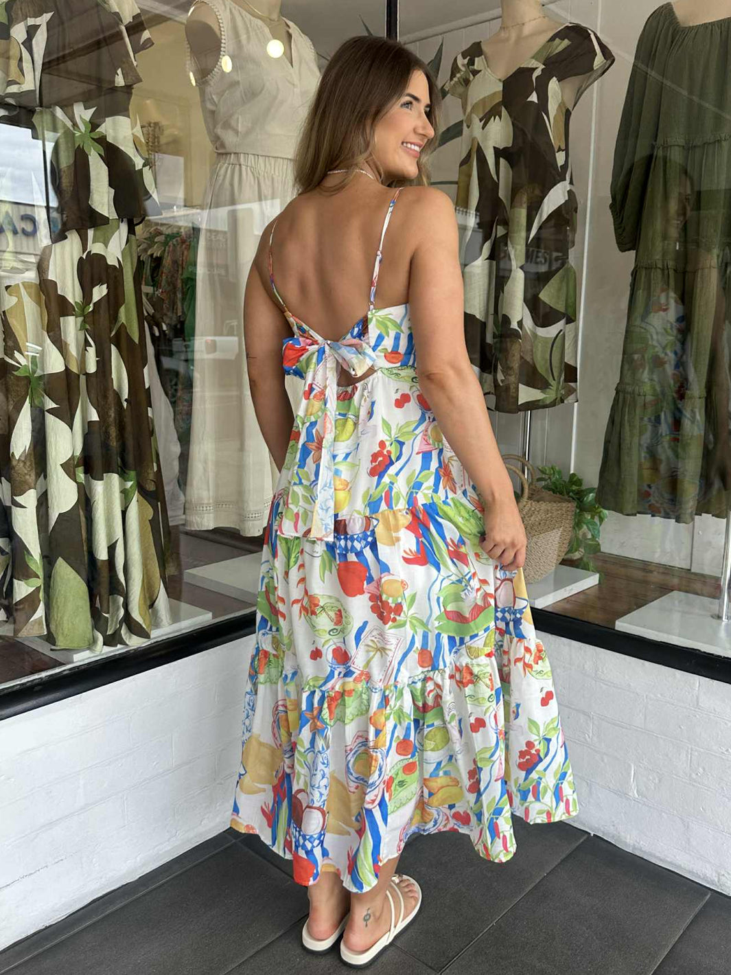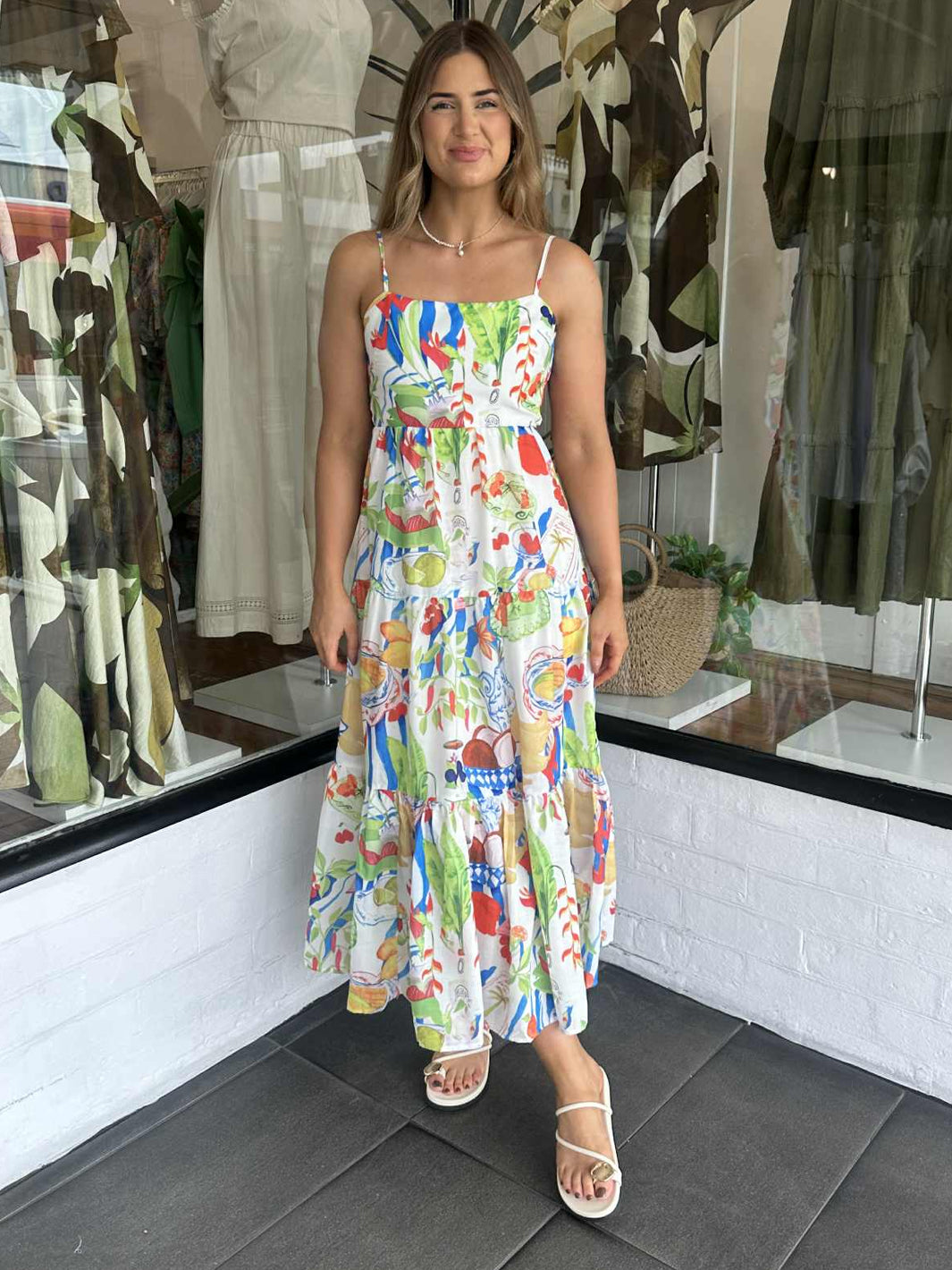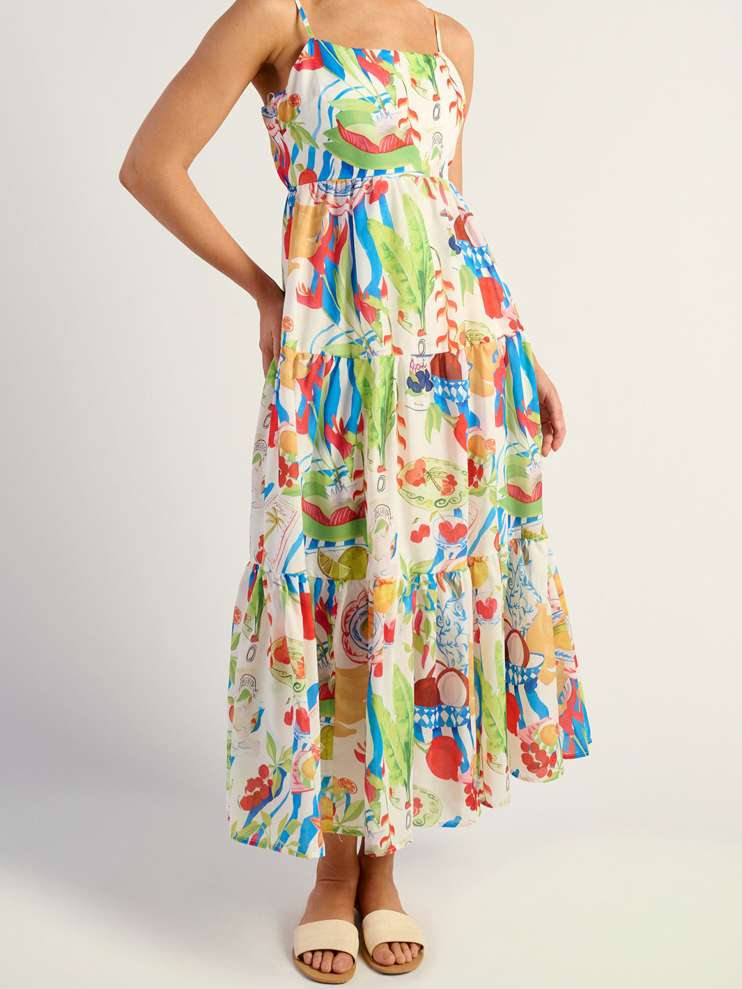 Bright, playful, and effortlessly chic the Fiesta Tiered Dress is crafted from a soft rayon blend fabrication featuring an exclusive fiesta print that captures the spirit of summer. The straight neckline and adjustable singlet straps offer a customizable fit, while gathering at the waistline flatters the silhouette.