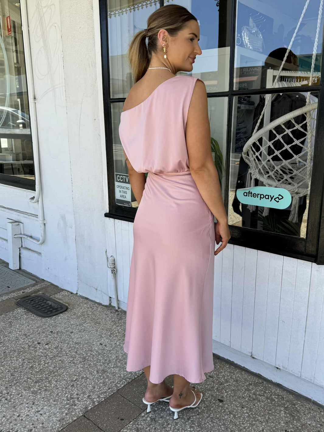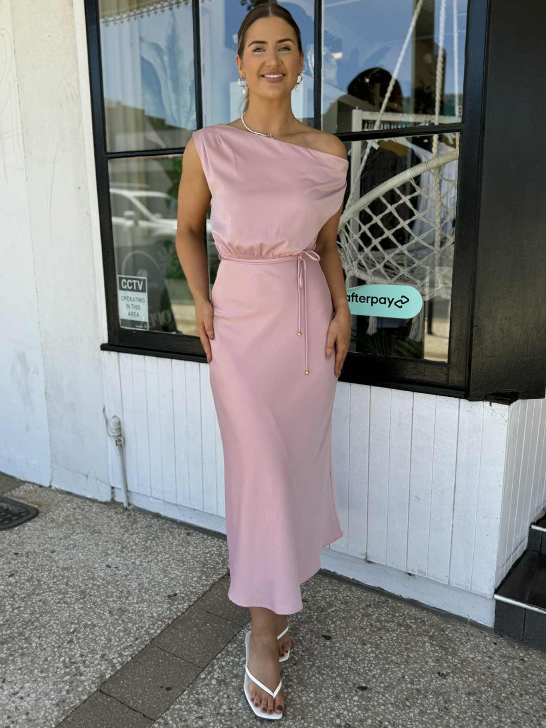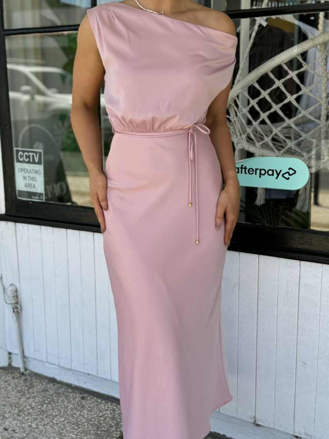 Step into effortless sophistication with the stunning Marisa Dress. Crafted from smooth, silky fabric in a soft blush pink hue, this dress features a draped off-shoulder neckline that beautifully accentuates the shoulders. The adjustable tie waist cinches perfectly to enhance your silhouette, while the straight-cut skirt flows gracefully to the floor for a timeless, elegant look..