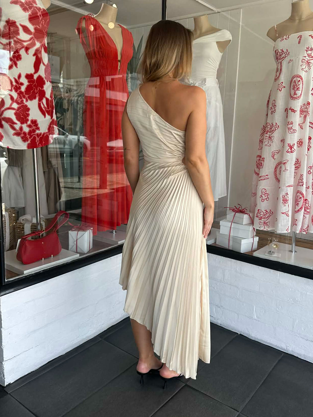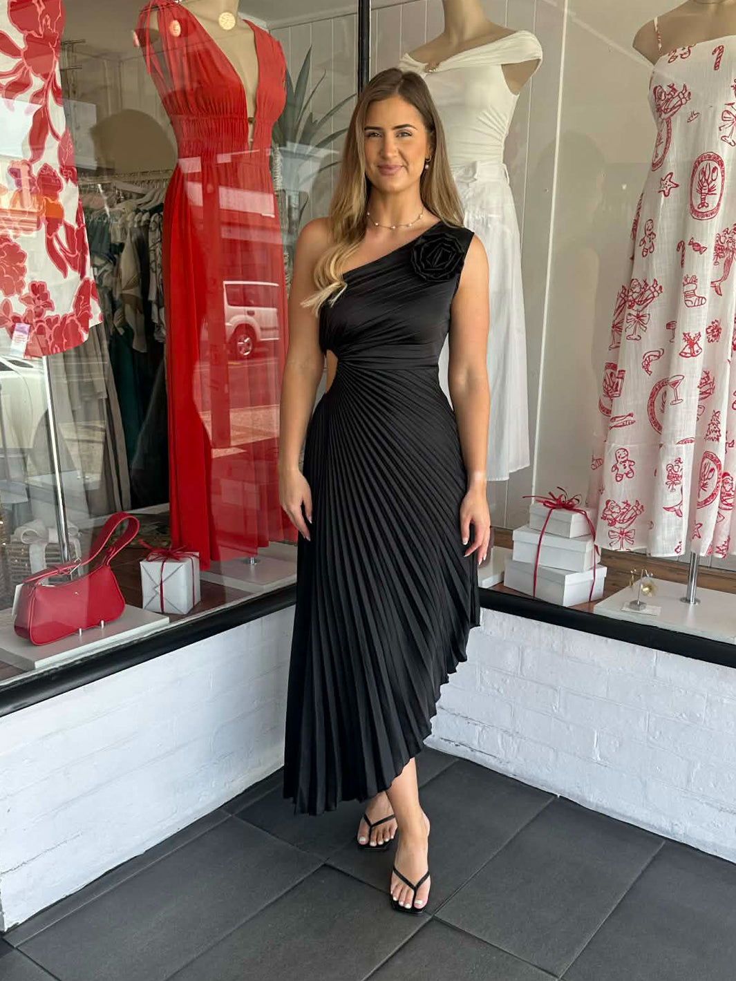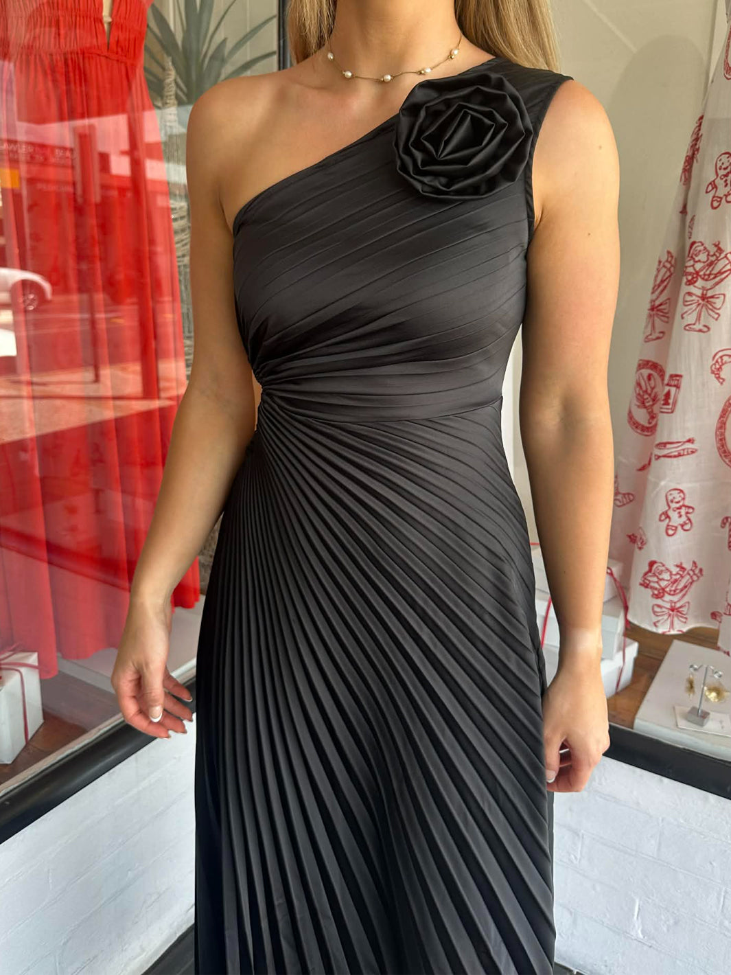 Make an elegant statement in our Olivia one-shoulder pleated midi dress. Designed with a flattering asymmetric neckline and a sculptural floral shoulder detail, this style beautifully contours the waist while flowing into soft, fluid pleats.