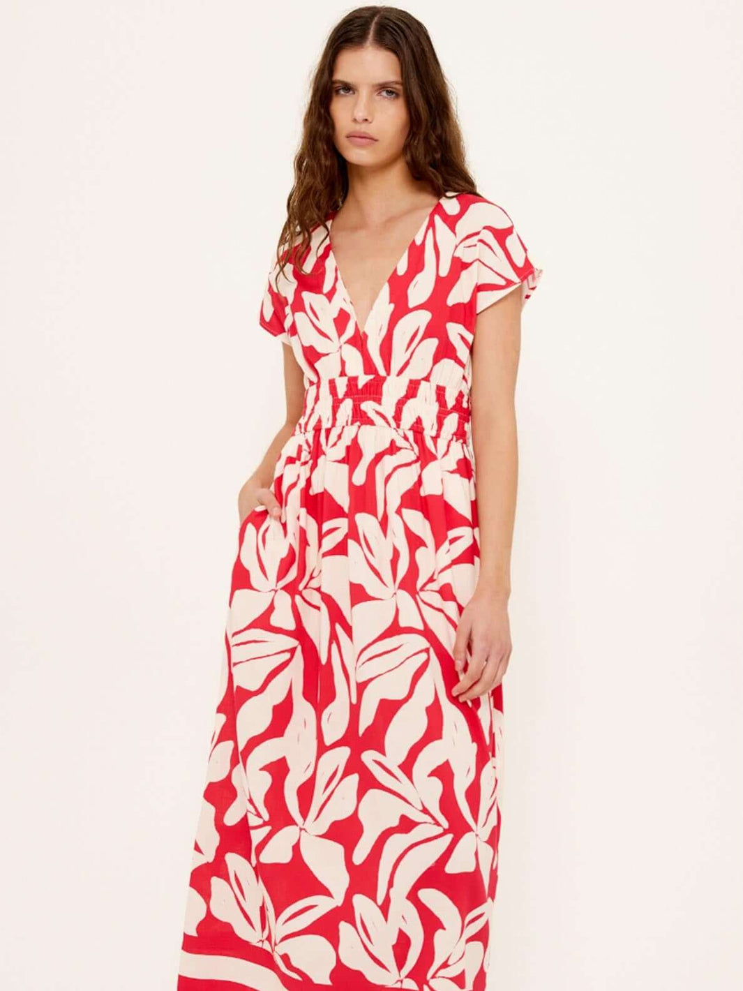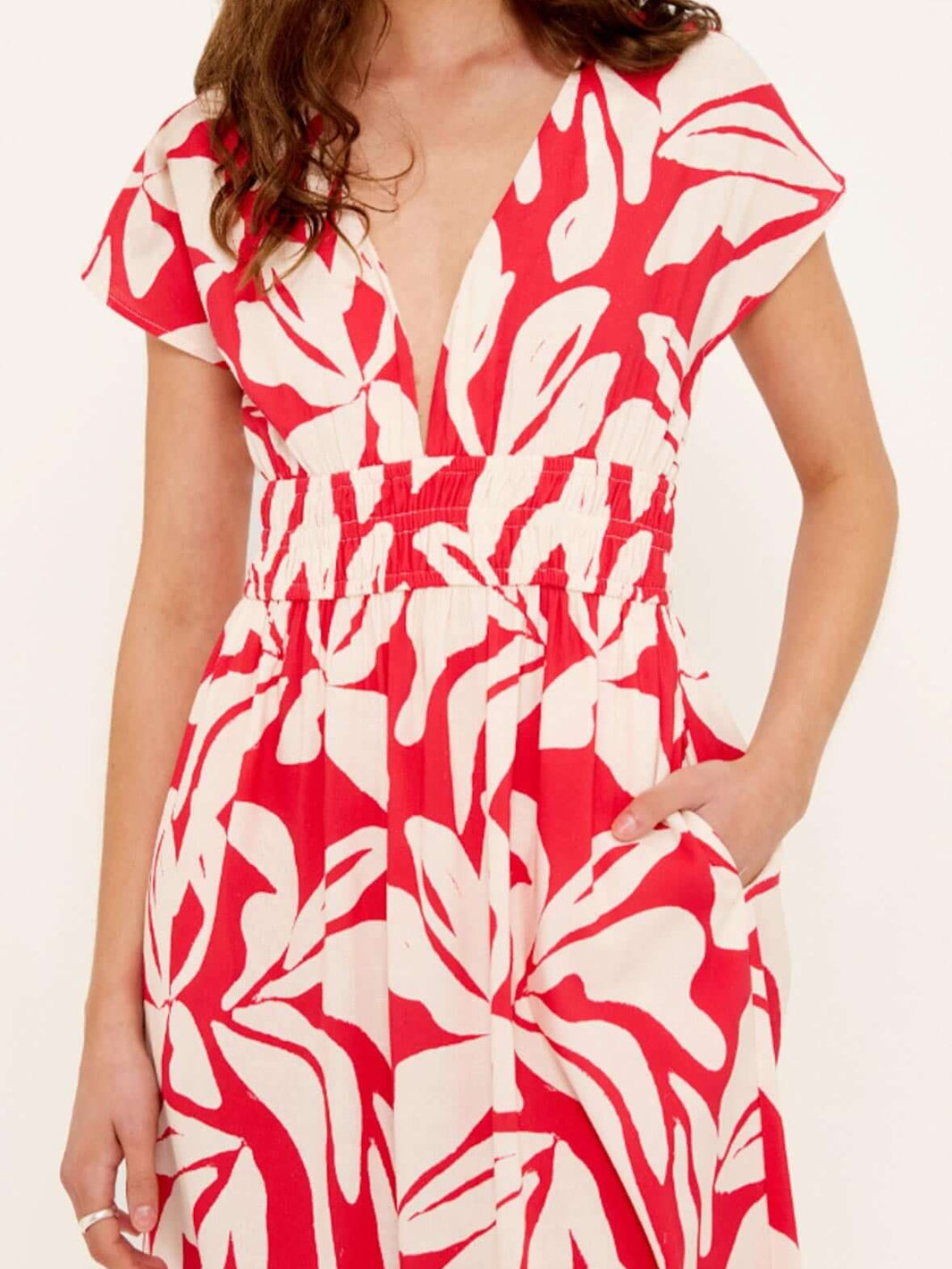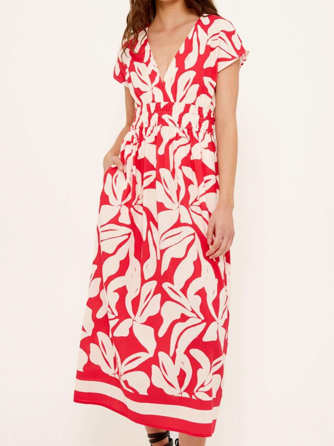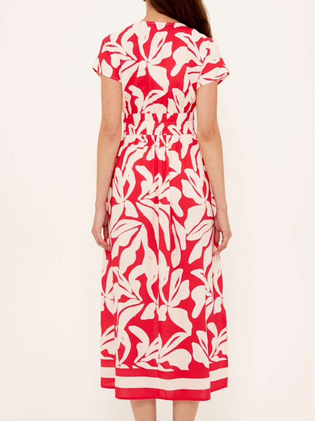 Effortlessly elegant, the Serata Cotton Blend Red & White Floral Asymmetrical Midi Dress captures the essence of warm evenings and statement style. Crafted from a breathable cotton-viscose blend, this dress features an asymmetric neckline and flattering gathered detailing that hugs the body in all the right places. The bold red and white print adds a touch of modern artistry, perfect for your next summer event.