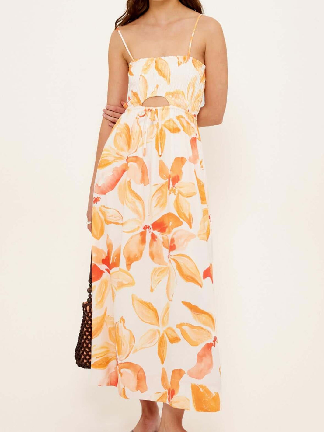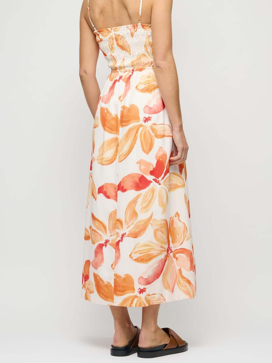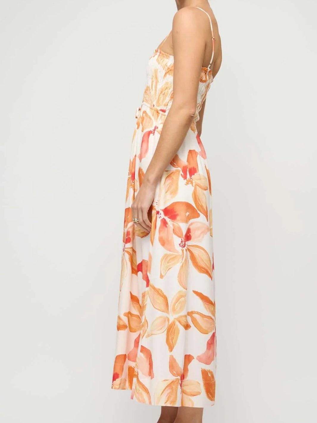 The Solana Orange & White Floral Shirred Midi Dress is made for effortless summer days. Featuring a shirred bodice with a subtle cut-out and flowing skirt, this dress balances comfort with coastal sophistication. Finished in our exclusive Solana print on a breathable linen-viscose blend.