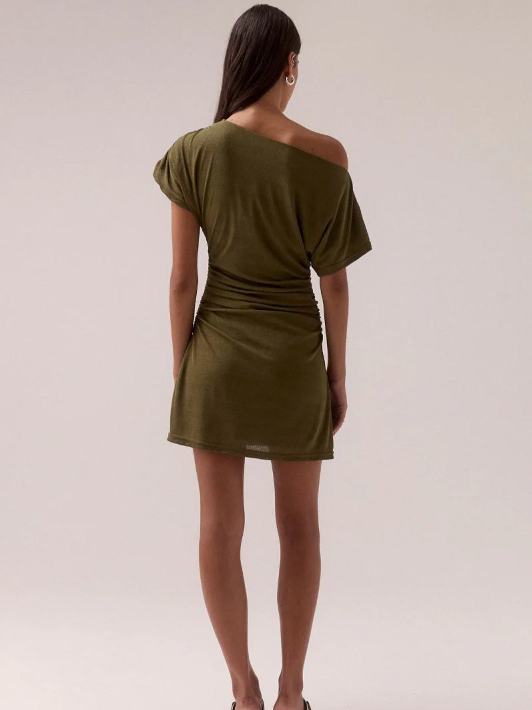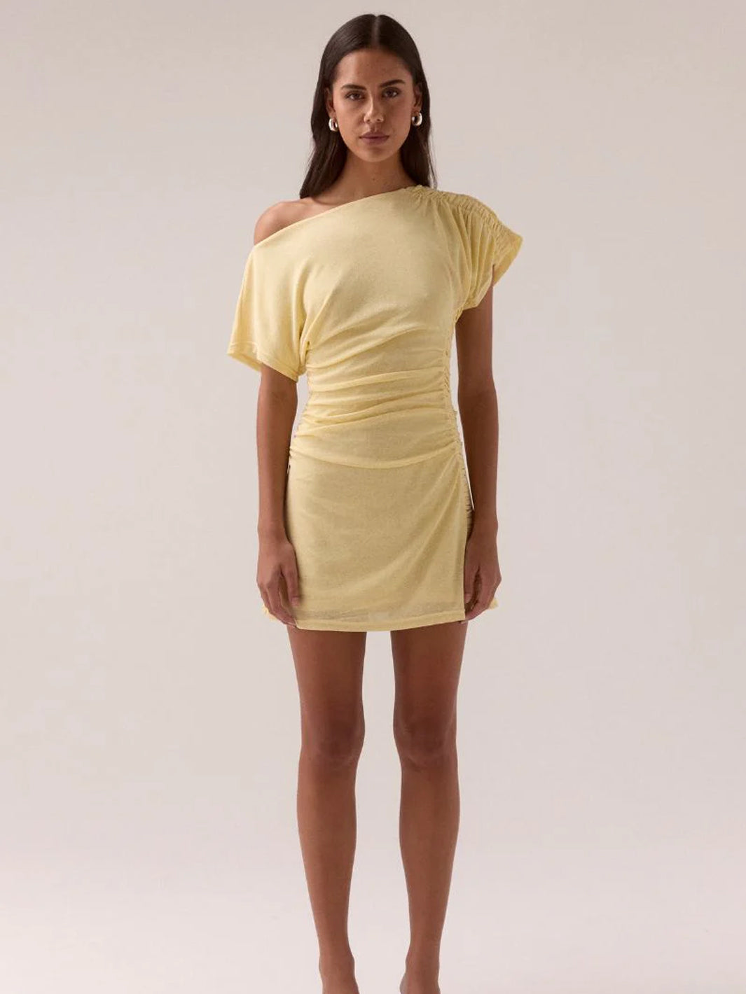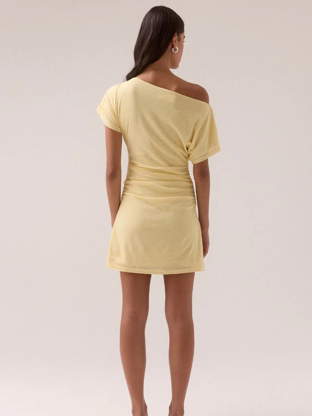 Elevate your wardrobe with the RUA Mini Dress by Sovere Studio. Expertly crafted from textured stretchy mesh for a perfect fit. This sophisticated off-shoulder design features a boat neckline and short magyar sleeves, enhanced by delicate gathers at the shoulder and body. A gathered panel detail gracefully adorns one shoulder and cascades down one side, adding subtle elegance. Fully lined for comfort and easy to wear with a simple pull-on style, this mini dress effortlessly combines refined style with modern ease.