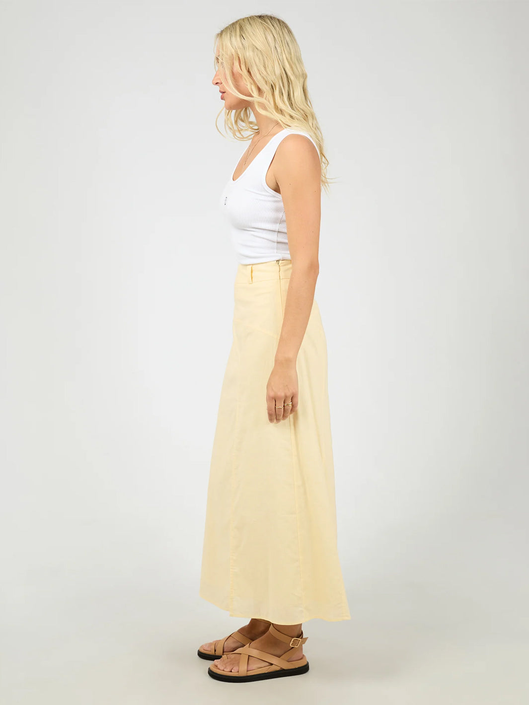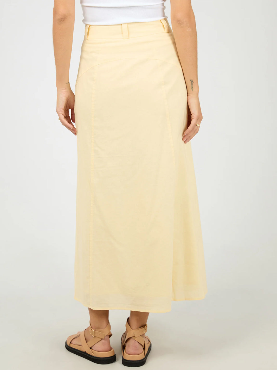 The Alessa Linen Maxi Skirt brings effortless elegance to sunny days, made from a breathable cotton-linen blend in a cheerful yellow hue. Featuring a side slit for ease of movement and belt loops for versatile styling, it's your go-to for laid-back polish. Pair it with a tucked-in tank or cropped blouse for an elevated spring look.