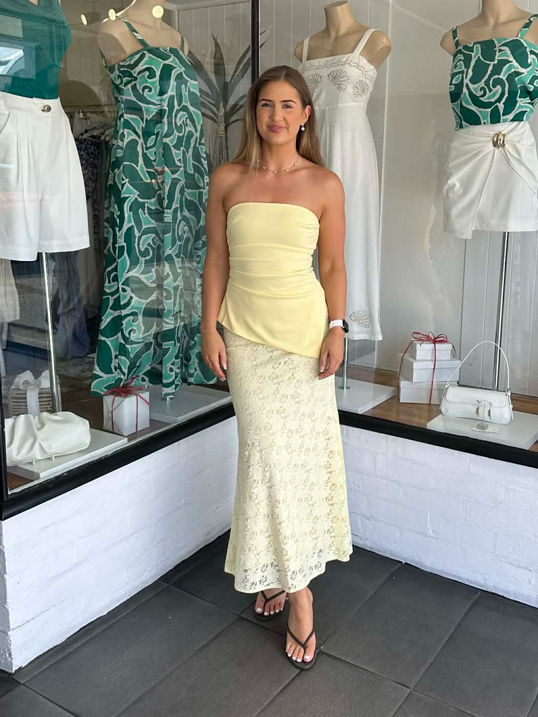 Elegant and contemporary, the Amie Lace Skirt & Top Set combines modern design with timeless femininity. The strapless top features an asymmetrical hem and a hidden side zipper for a polished finish, while the coordinating lace midi skirt is detailed for a flattering fit. A side zipper on the skirt ensures a smooth, seamless silhouette, making this set a sophisticated choice for any occasion.
