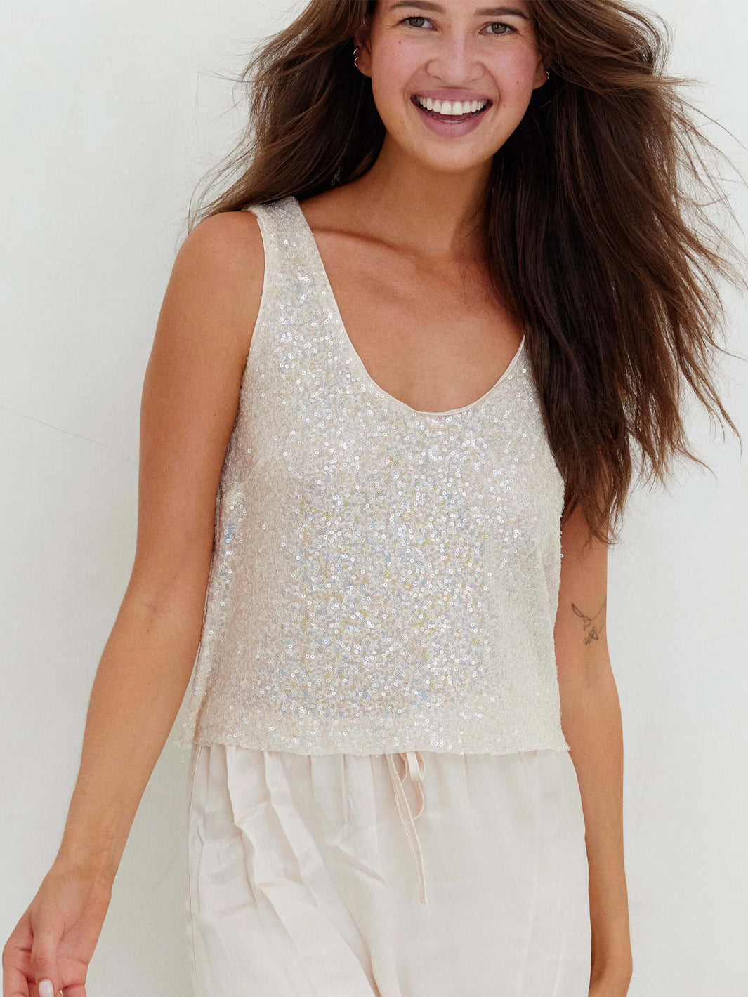 Turn heads in the Asta Top, a semi-sheer, sequined statement piece with an effortless boxy fit. Designed to sparkle, it delivers instant glamour while keeping things relaxed and comfortable. Layer it over your favorite essentials or wear it on its own for bold impact—perfect for shining bright with minimal effort.