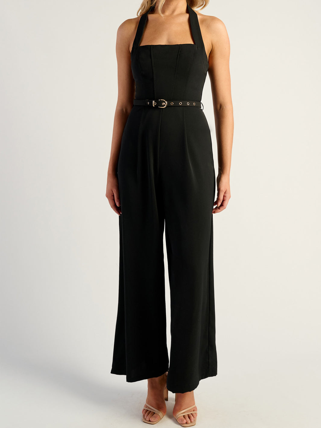 Elevate your occasion style with this sophisticated wide-leg jumpsuit, crafted from a dressy fabrication that drapes beautifully for a refined finish. The halter neckline features an adjustable button closure at the back for a customizable fit, while panel seam detailing at the bodice flatters your shape. A centre back shirred panel adds subtle comfort and flexibility, ensuring a sleek silhouette from every angle.