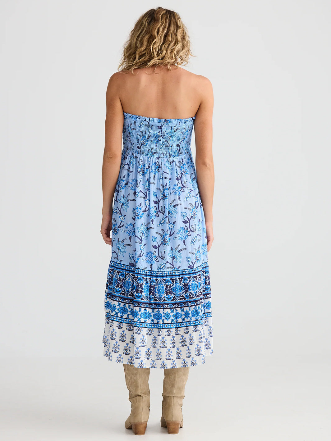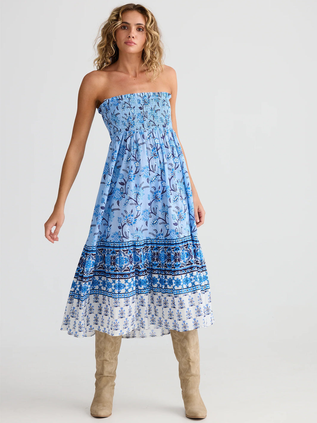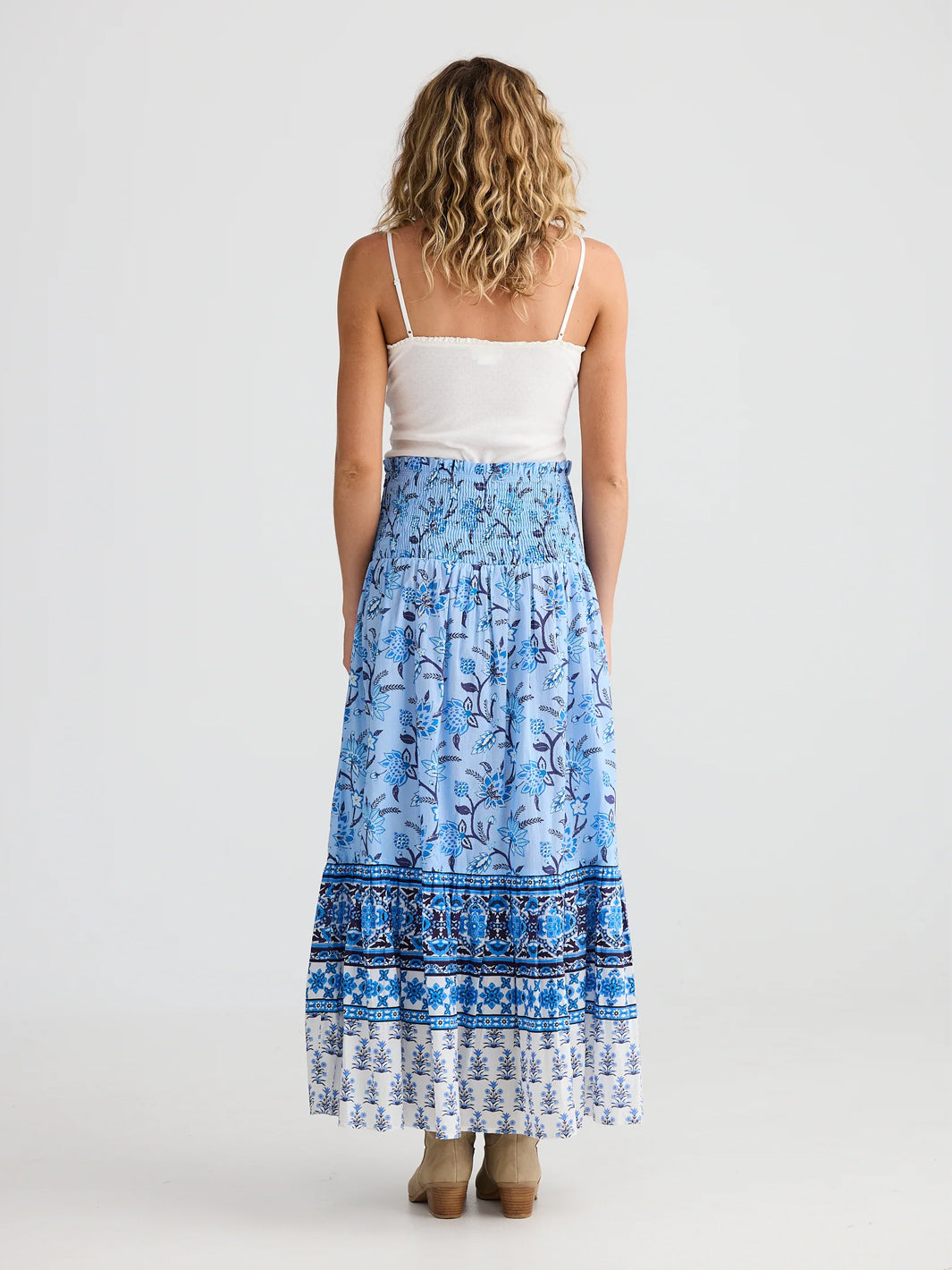 Twice the style, double the charm — the Sangria Skirt is the ultimate in effortless versatility. Designed with a soft shirred waist panel and flowing gathered tiers, this piece can be worn high or low on the waist as a skirt, or styled as a strapless midi dress for an easy, breezy look. Made from 100% breathable cotton.