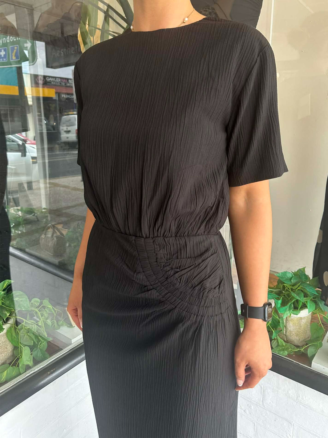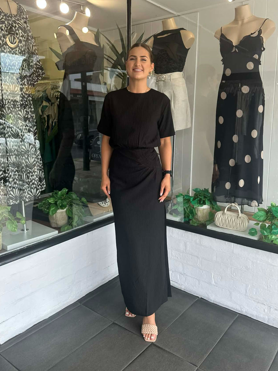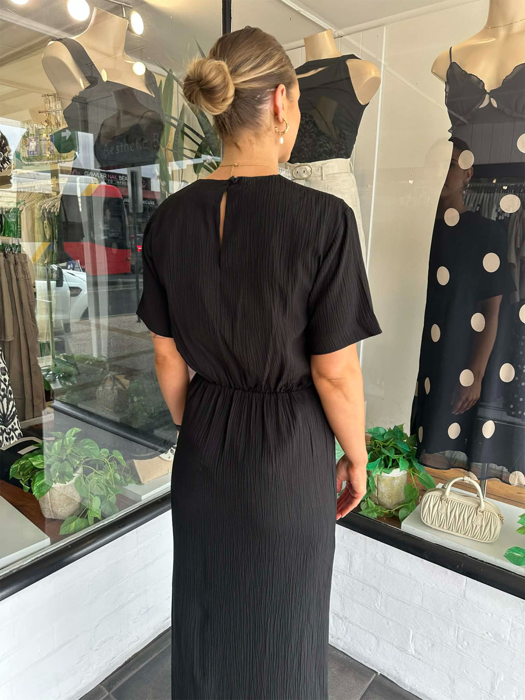 Effortless and elevated, the Aine Dress is crafted from a textured crinkle fabrication that adds depth and movement to a timeless silhouette. This T-shirt–style maxi dress features a classic crew neckline, short sleeves, and dropped shoulders for a relaxed, modern feel. An elasticated waist subtly shapes the body, while an encased elastic detail at the hip creates soft gathers for added dimension. A side split enhances flow and ease of movement, complemented by a back keyhole with a button-and-loop closure for a refined finish. Fully lined and designed with slip-on functionality, the Áine Dress brings together comfort, texture, and understated elegance.