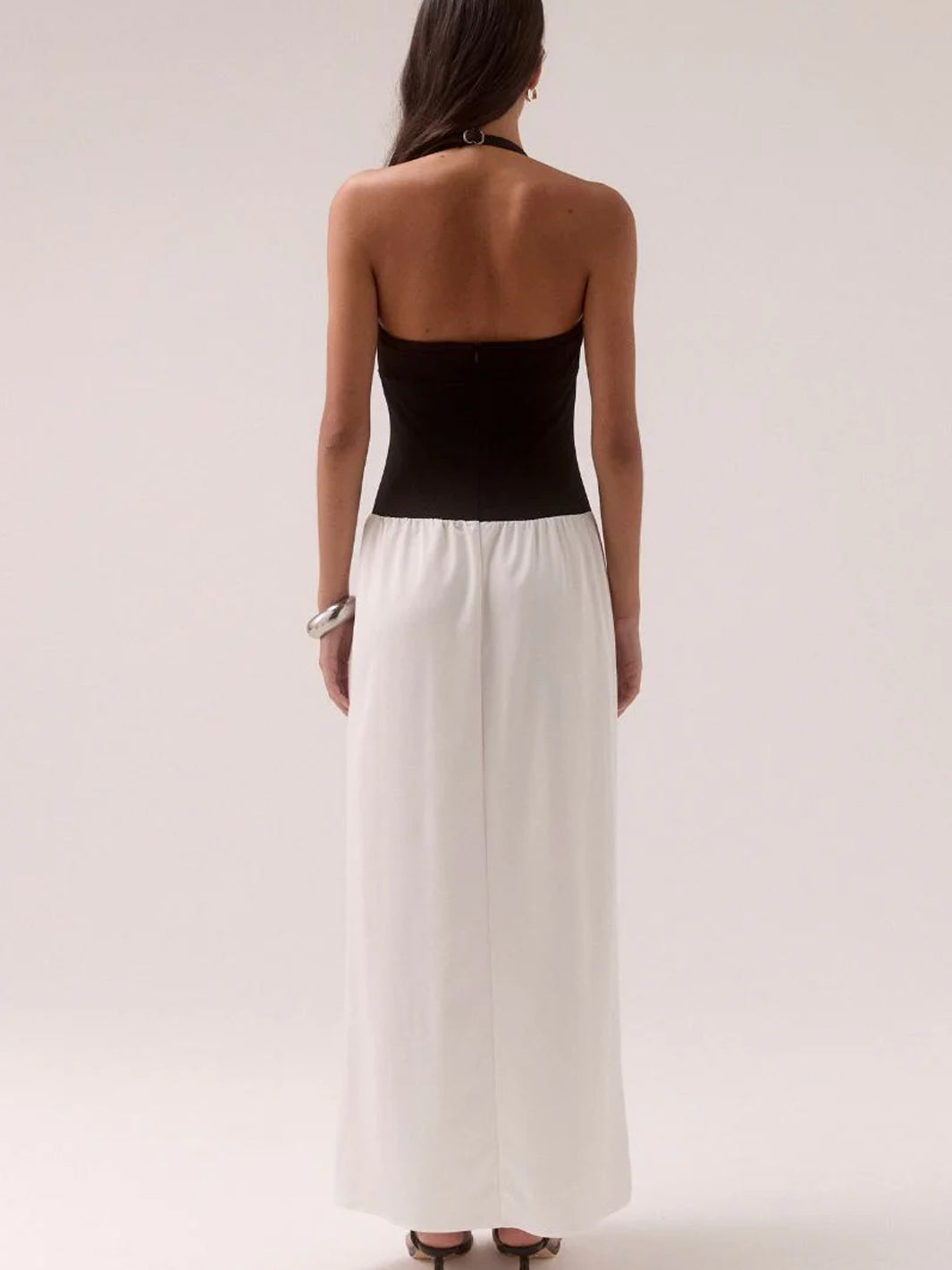The Demi Dress in Black/Chalk blends soft tailoring with modern elegance. Crafted with a viscose-blend bodice and a fluid lyocell skirt, this halter-style maxi dress features a scooped neckline and sculpted underbust seam for definition. Adjustable silver metal slider details at the front strap and back neck add a subtle shine, while body-shaping panels and soft gathers create a flattering, flowy silhouette.