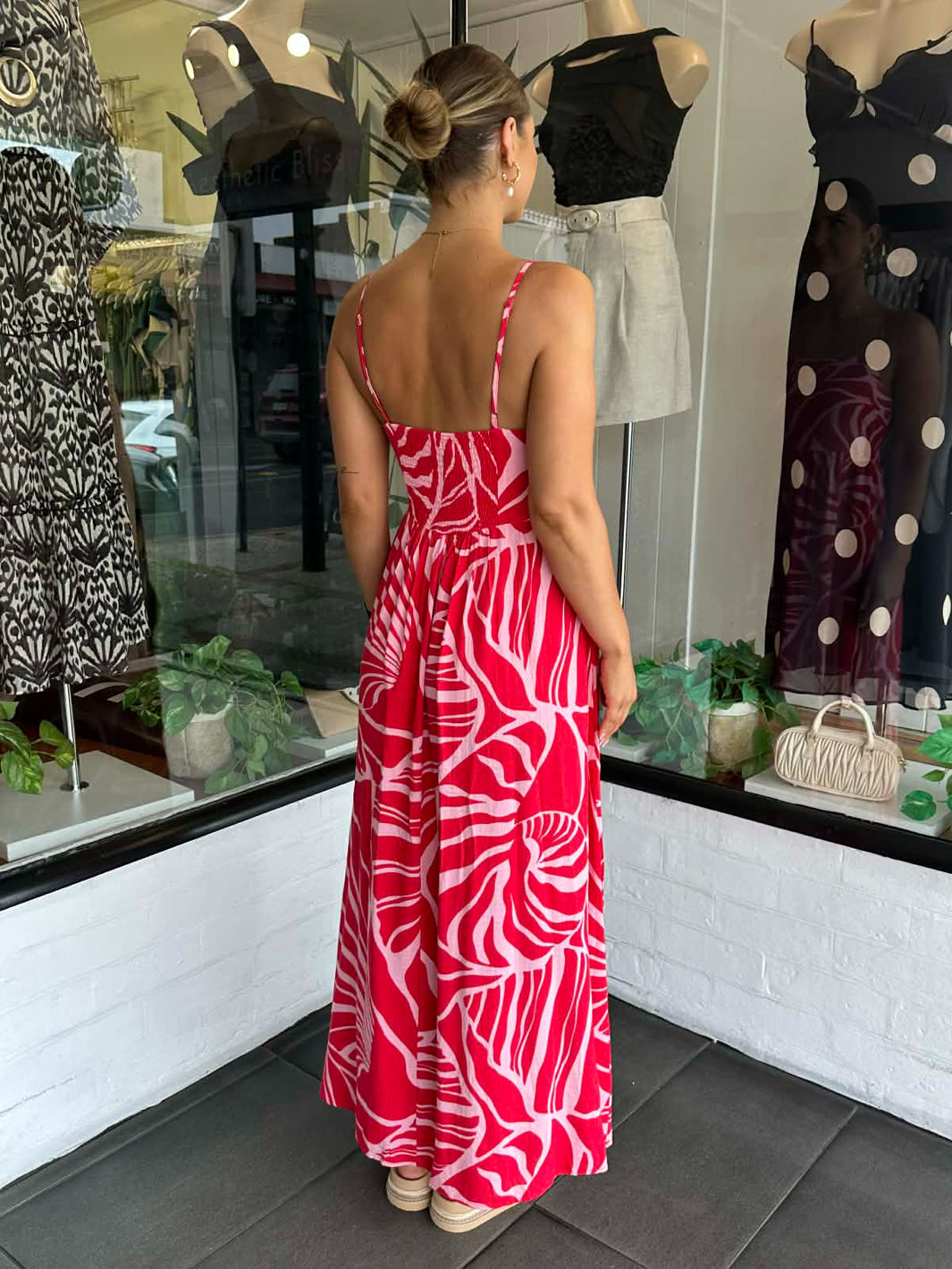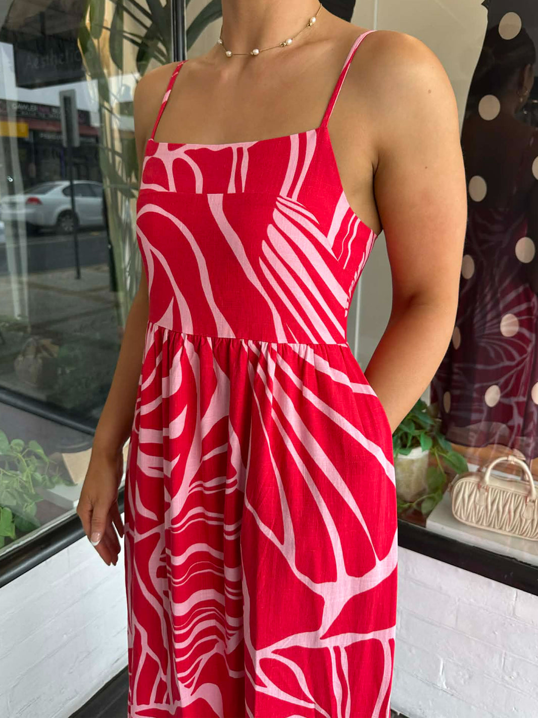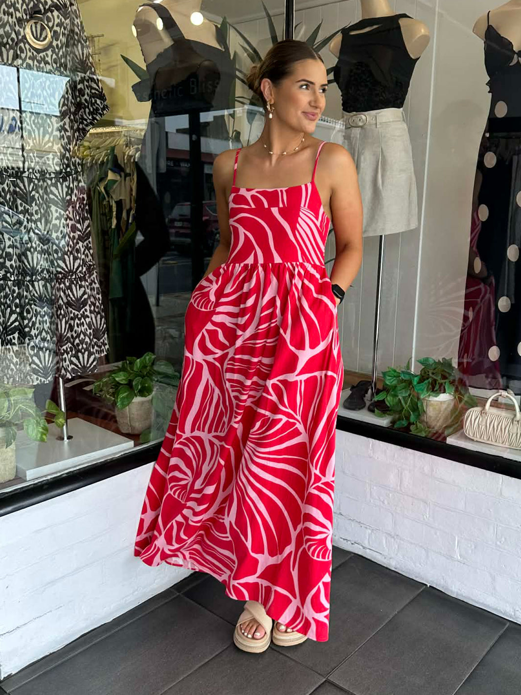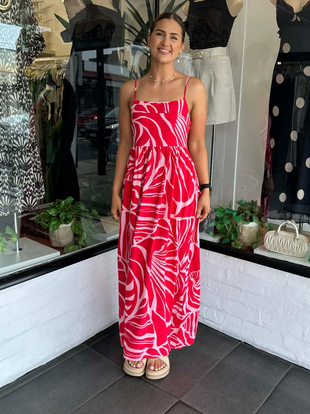 Turn heads all season long with this striking red and white abstract print maxi dress. Designed with a bold, swirling pattern, this piece blends effortless comfort with standout style. The soft, flowing fabric drapes beautifully, while the adjustable slim straps and square neckline create a flattering, feminine silhouette.