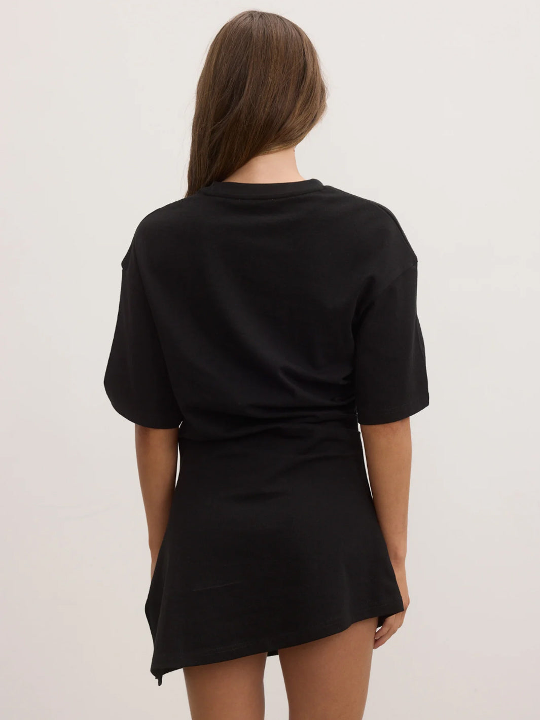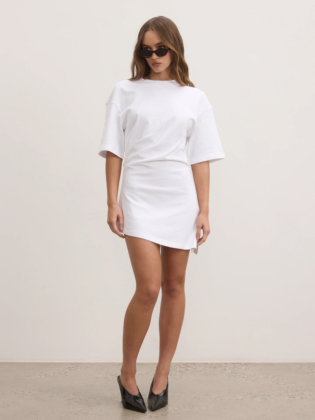 The Joanna Dress brings effortless ease to your wardrobe. Crafted in a soft cotton blend, it features a relaxed t-shirt silhouette with dropped shoulders and an asymmetric hemline for a modern edge.