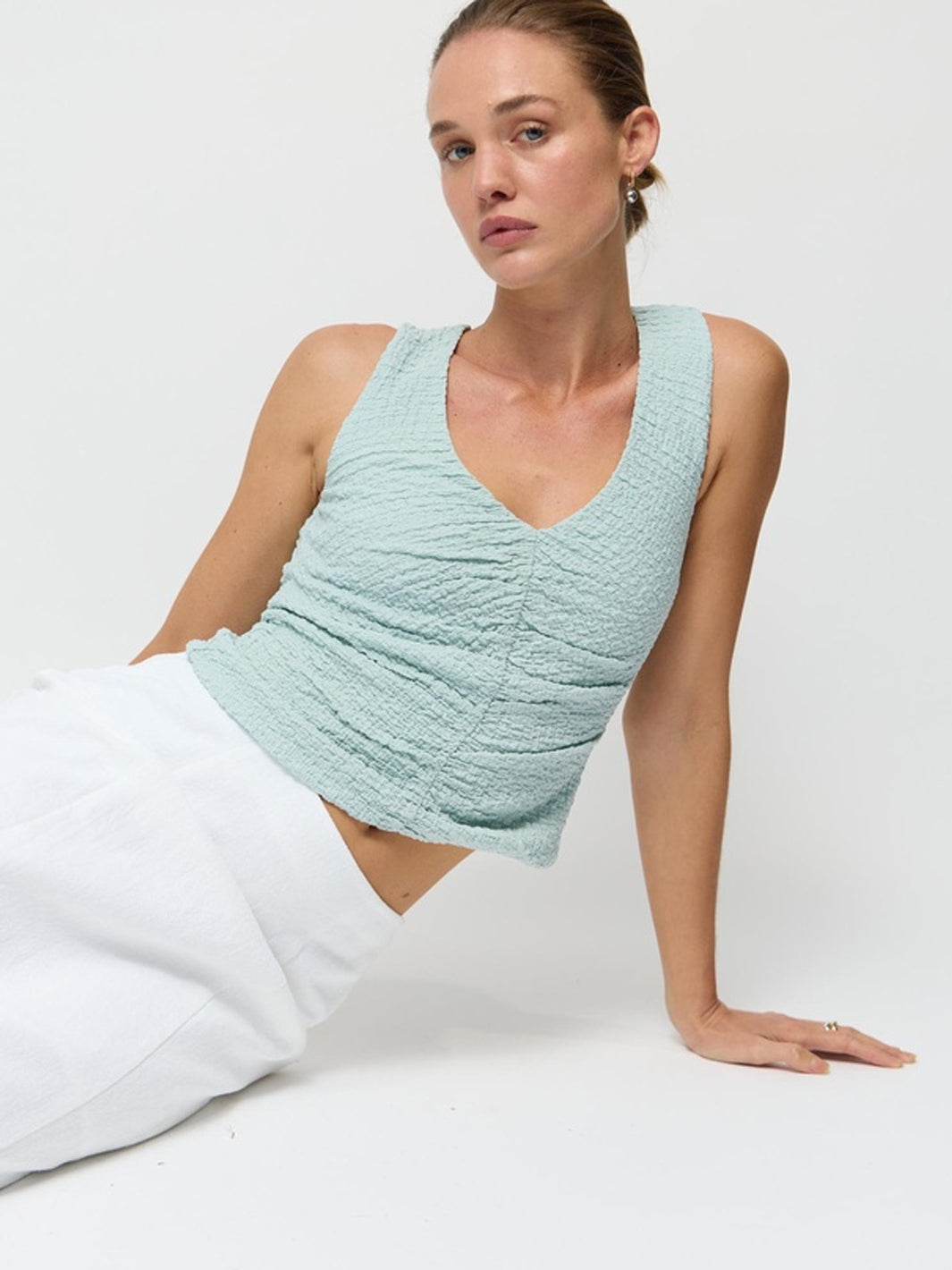 This cropped top is crafted from textured, lined fabric with minimal stretch. It features a flattering V-neckline, a sleeveless cut with fixed wide straps, and ruching at the front and back for a sculpted, feminine fit.