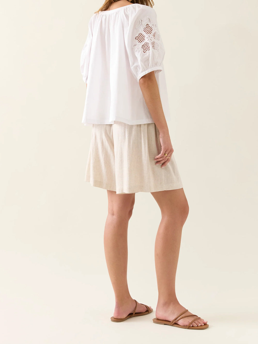 • Short puff sleeves with cut-out embroidery