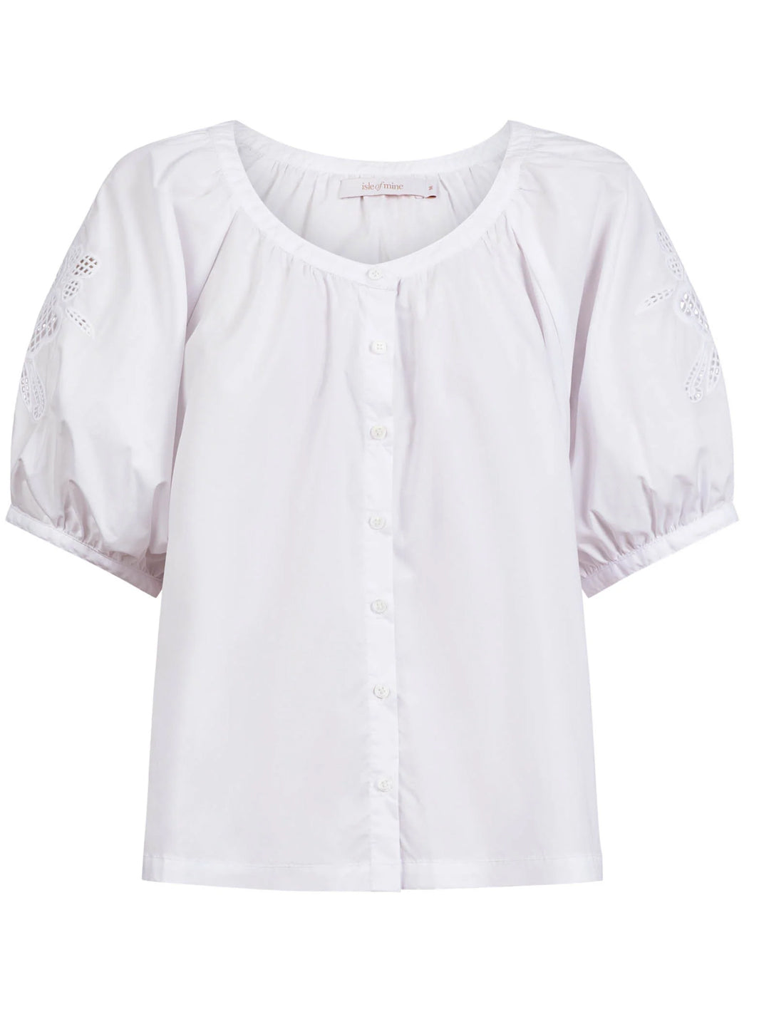 Crisp cotton poplin meets delicate cutwork embroidery in the Nilsa Button Top. Featuring a button-through front and softly puffed short sleeves, this charming piece reveals just a hint of skin through its intricate embroidered details.