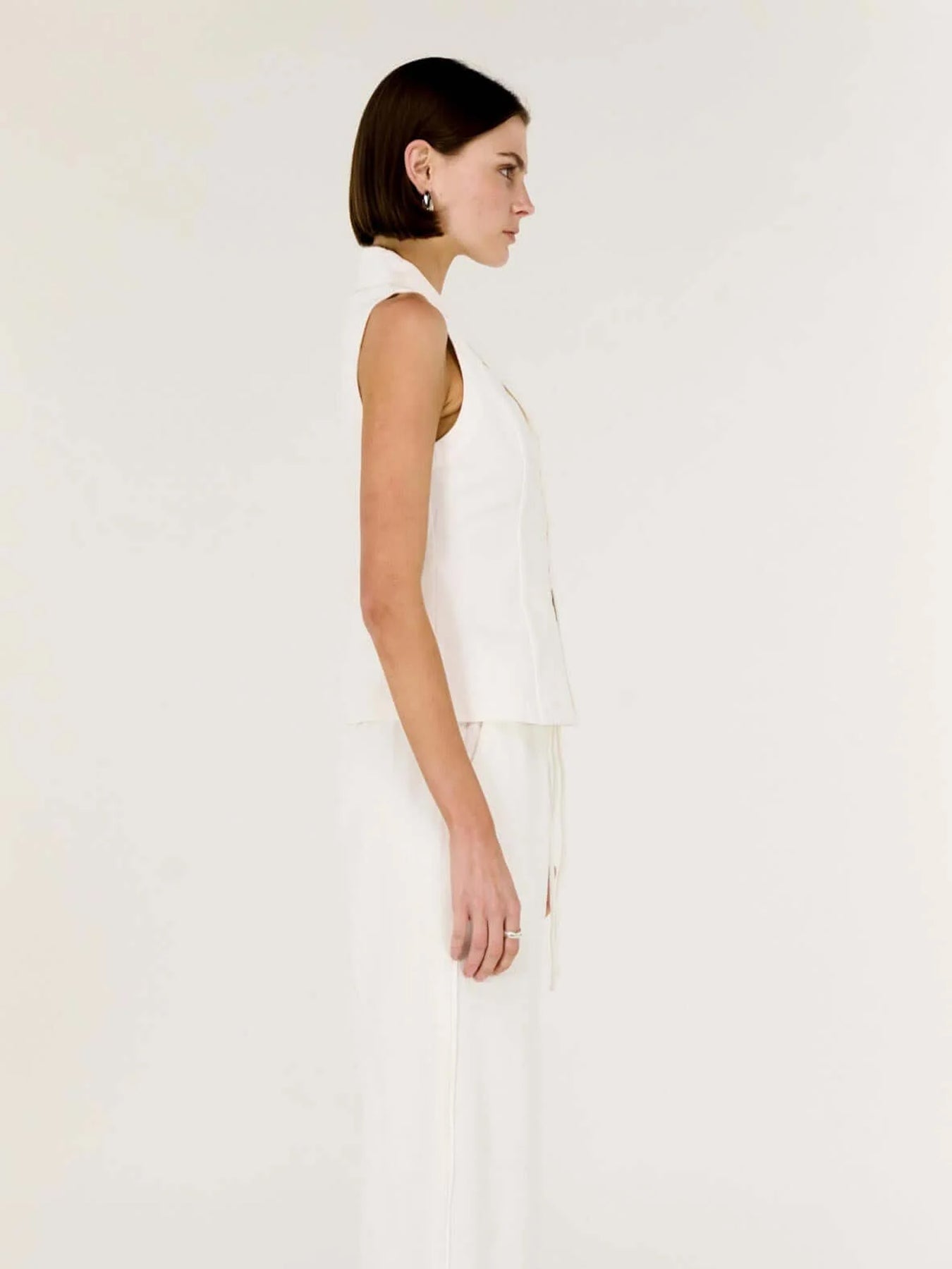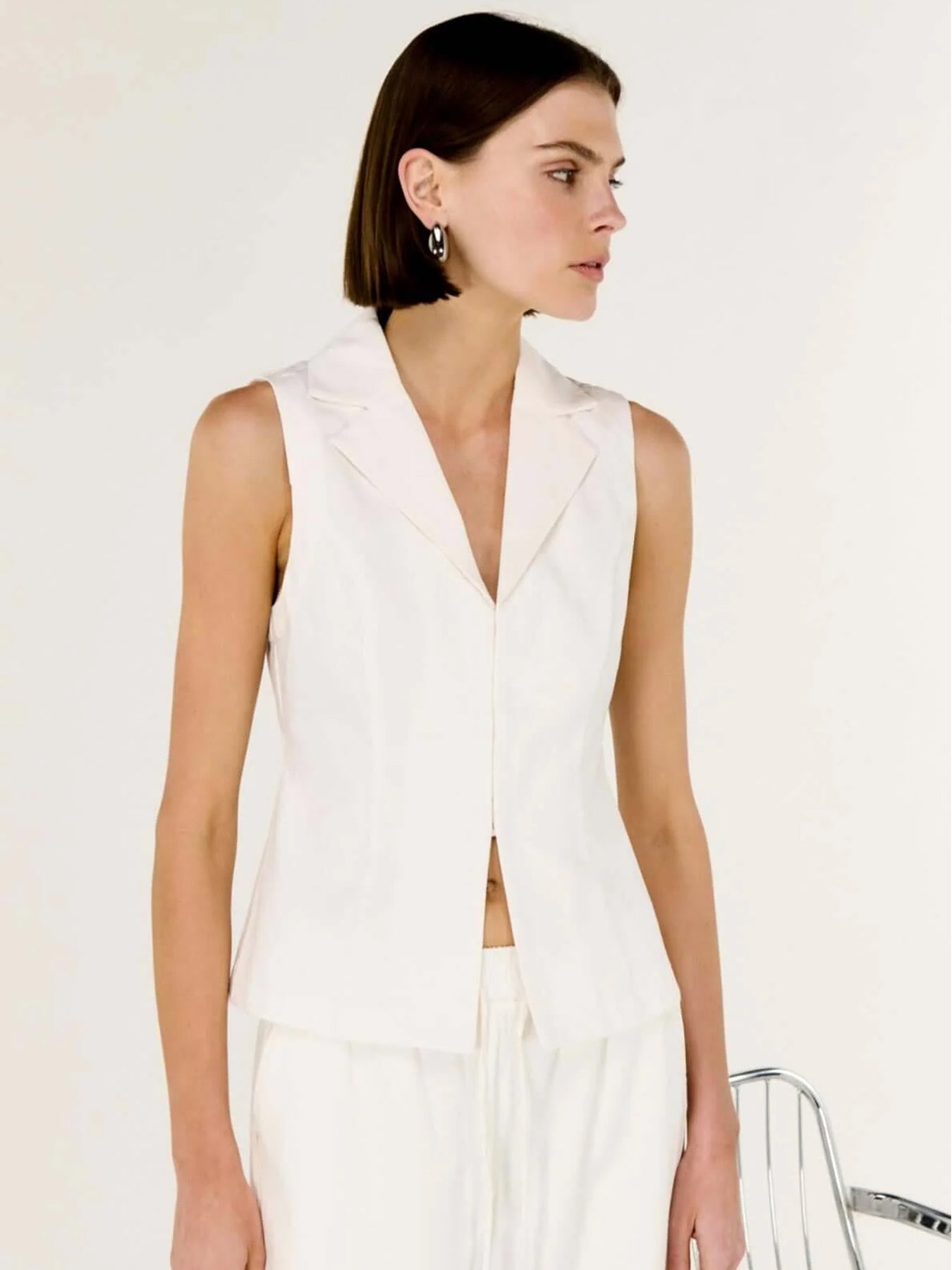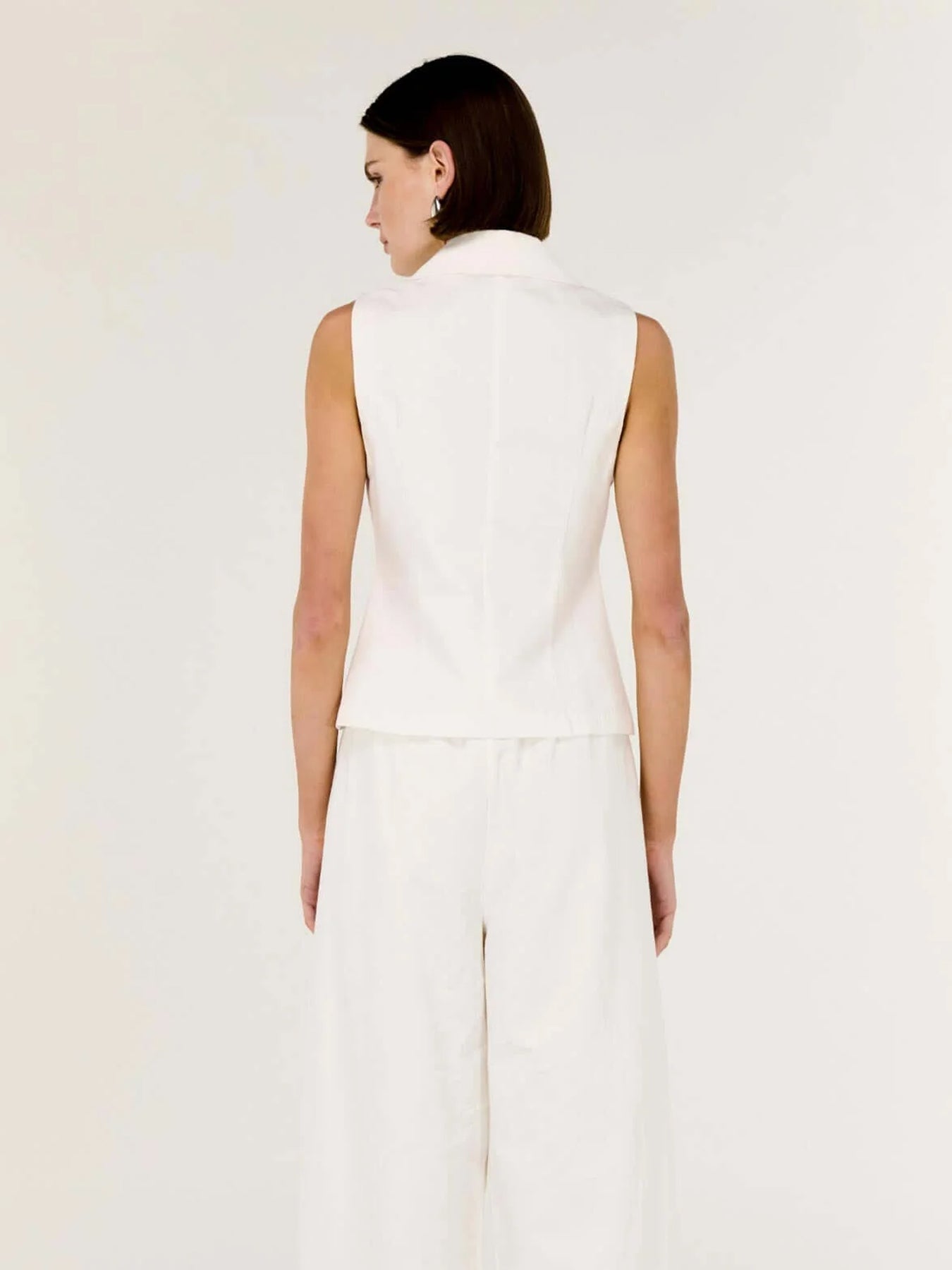 The Portia White Cotton Tailored Vest Top delivers a refined take on modern tailoring with a soft, effortless edge. Crafted from breathable cotton drill, this sleeveless silhouette features a sharp lapel neckline and a streamlined fit that skims the body. Designed to be worn solo or layered, it offers versatility for both work and weekend styling.