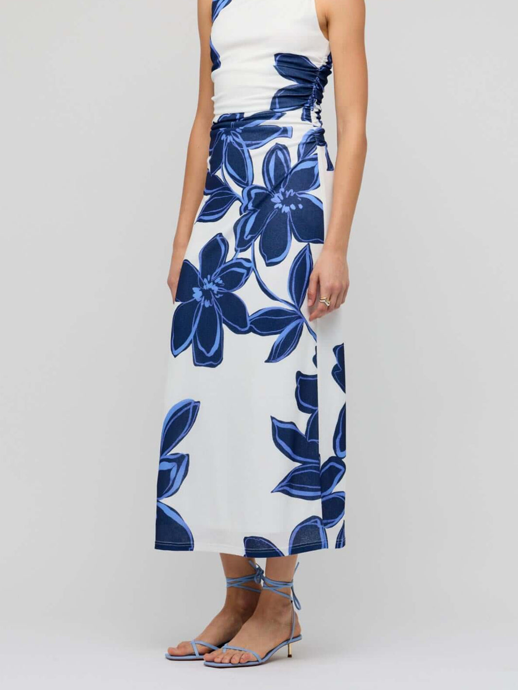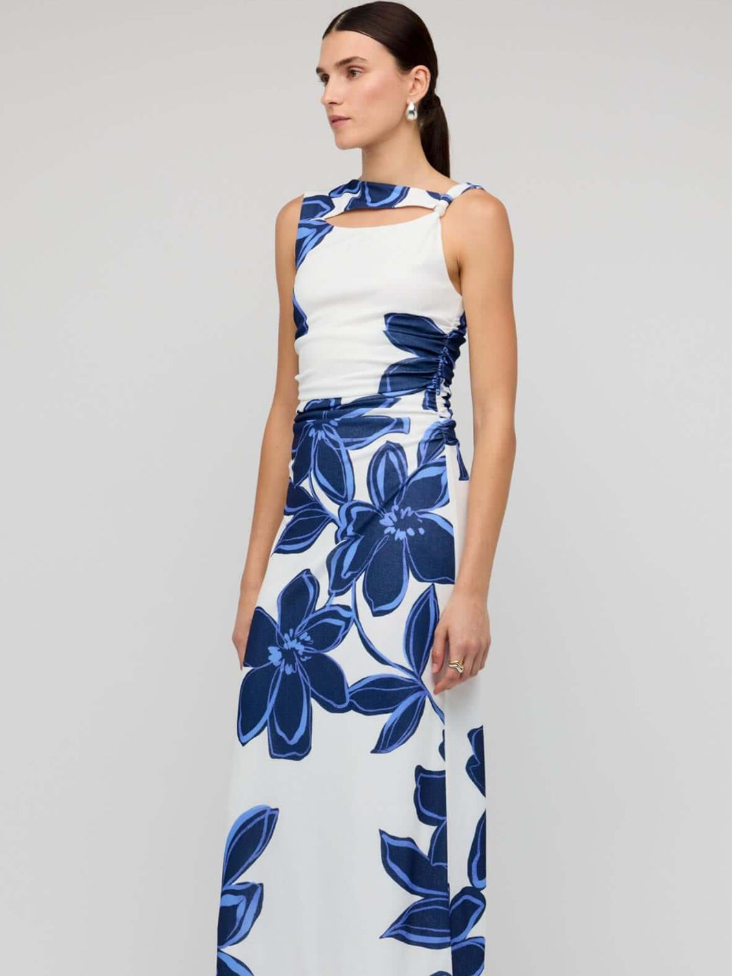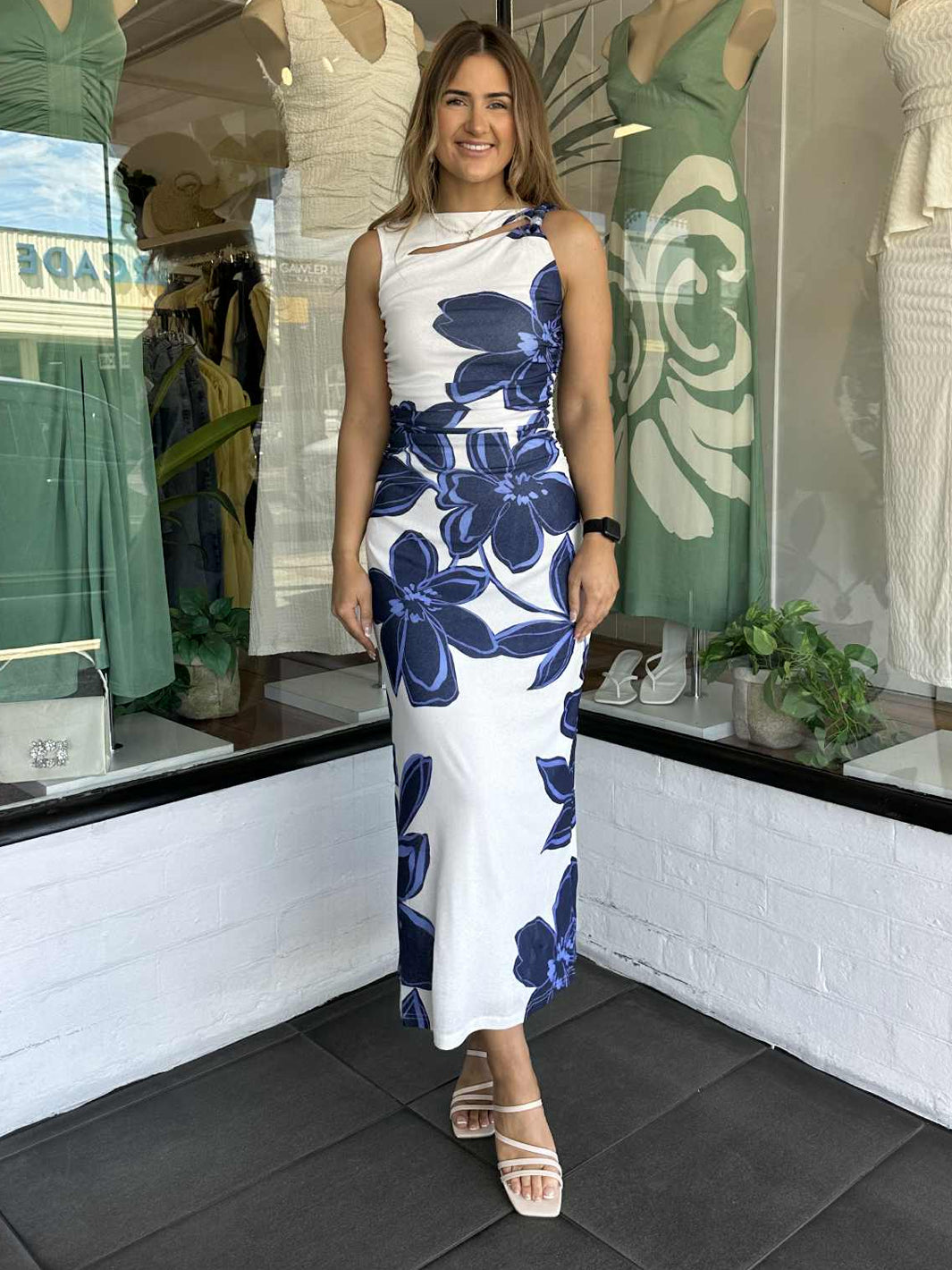 Turn heads in the Ethos Blue & White Floral Mesh Midi Dress by Staple the Label, a striking fitted silhouette featuring a bold oversized floral print. Designed in stretch mesh with a soft lining, this midi dress offers comfort and style in equal measure. The sleeveless cut and high neckline with cut-out detail flatter the form, while side ruching enhances the fit. Perfect for summer events, cocktail evenings, or styled casually with sandals.