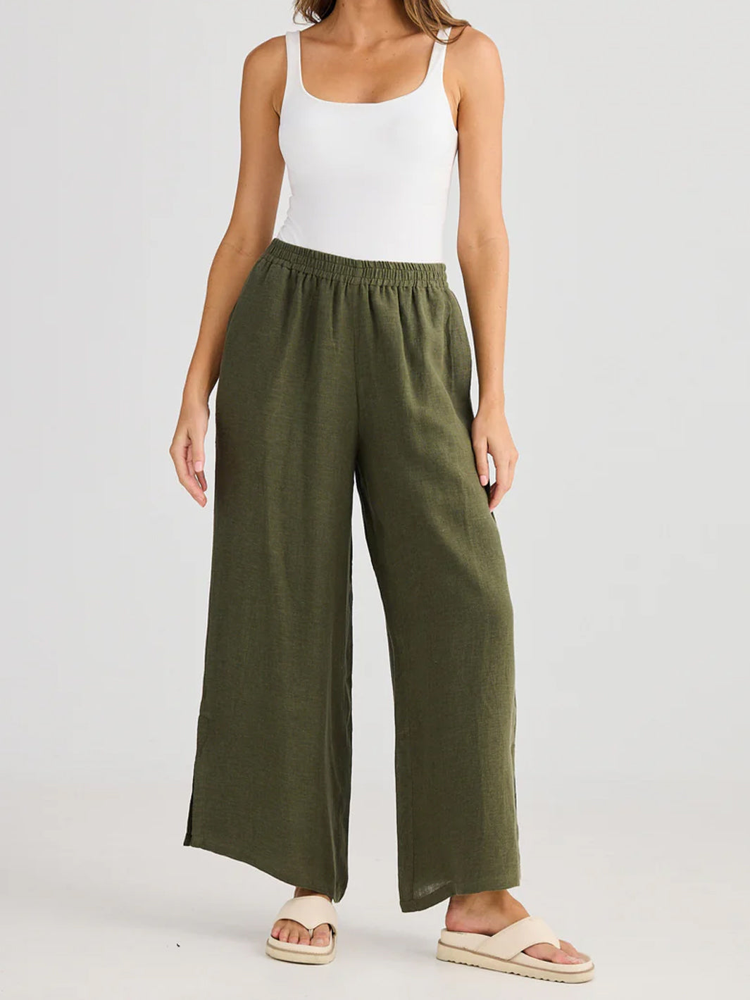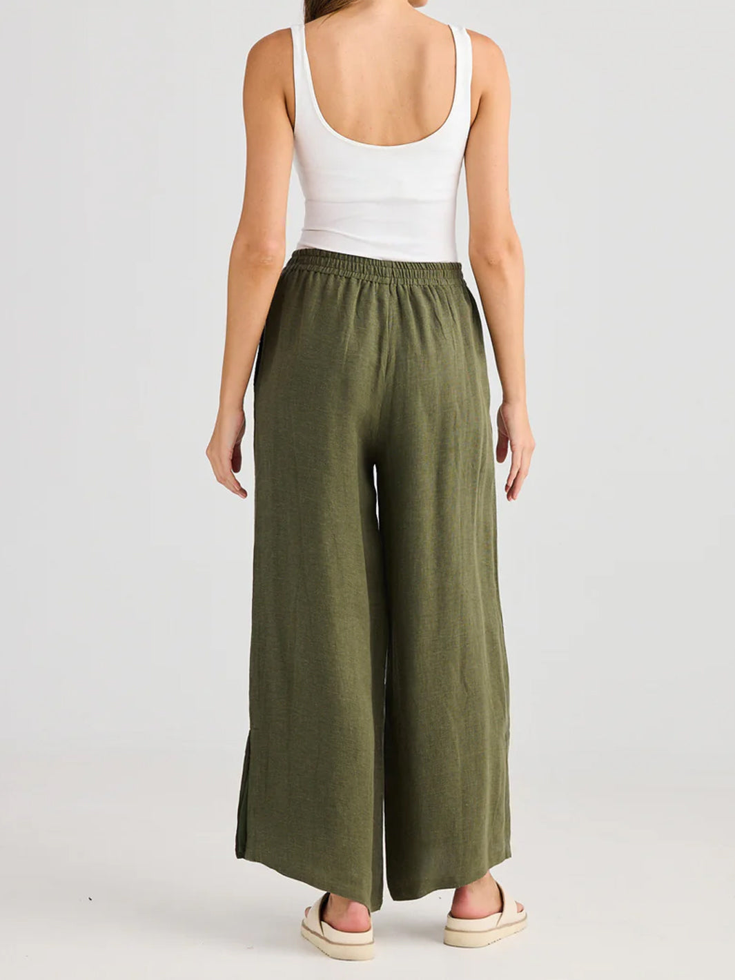 Combining comfort with modern ease, these wide-leg pants are designed with an elasticated waistband for a flexible fit and effortless wear. In-seam pockets offer practical functionality, while subtle side splits add movement and a touch of flair. Perfect for relaxed days or elevated with your favorite blouse for a refined look.