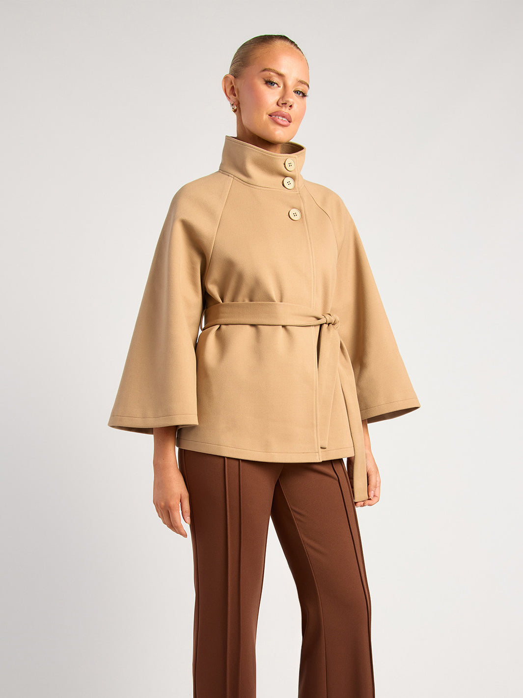 Elevated and effortlessly polished, this cape coat is designed in a dressy fabrication for a structured yet fluid silhouette. Featuring a modern funnel neckline and flowing cape-style design, it drapes beautifully over the body for a sophisticated statement. Finished with a self-fabric tie to define the waist and a fully lined interior for comfort, this piece is perfect for refined layering.