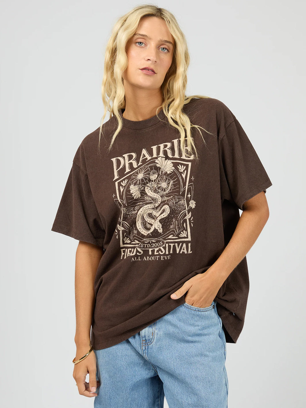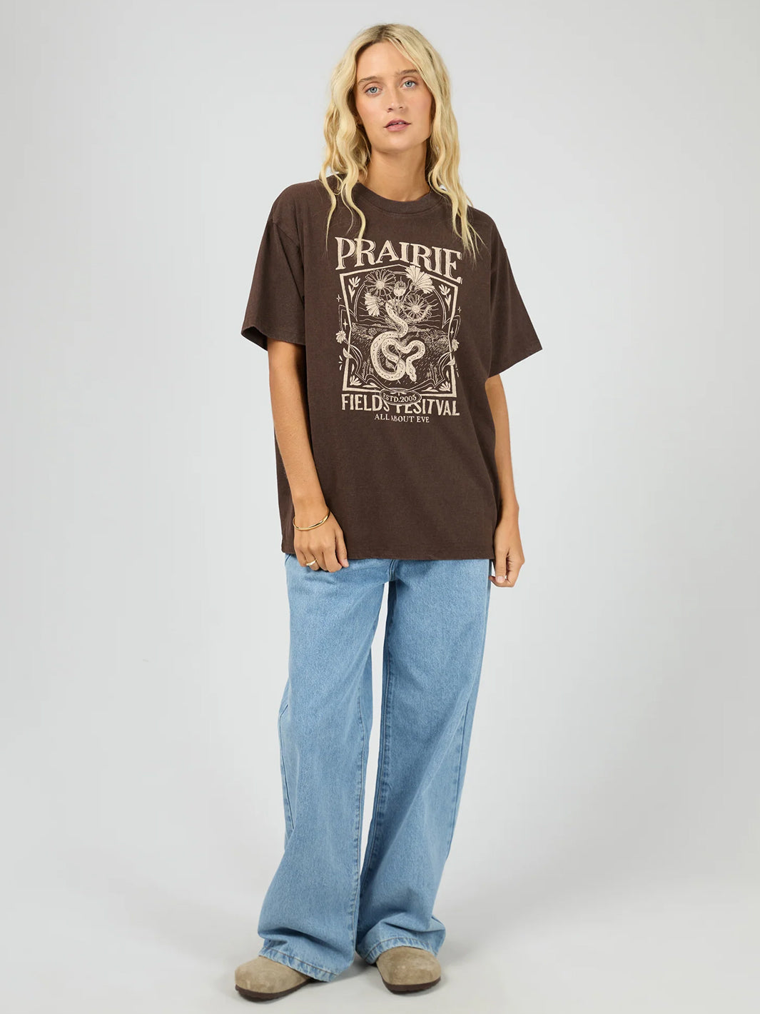 Meet the Prairie Relaxed Tee in Brown, the one that will guide you to embrace gentle, effortless comfort as the days begin to cool. Crafted from a soft cotton jersey on a classic vintage wash and featuring an All About Eve exclusive Fields Festival graphic print. Pair it with your most loved jeans or shorts for your next day out strolling along the river with friends.